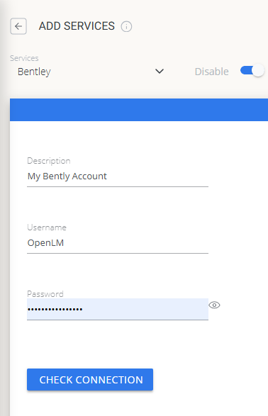 - Add Credentials: In the OpenLM Cloud Broker dashboard, find the Bentley integration and enter user name and password.