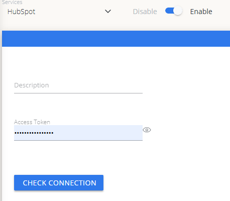OpenLM Cloud Broker ダッシュボードで HubSpot 連携を選択し、プライベートアプリのアクセス トークンを入力します。