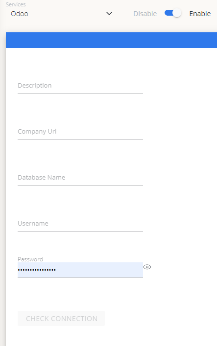 OpenLM Cloud Broker ダッシュボードで Odoo 連携を選択し、会社 URL、データベース名、ユーザー名、パスワードを入力します。