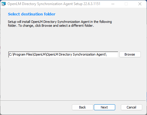 1. You can change the installation folder if you want. The default one is C:Program FilesOpenLMOpenLM Directory Sync (DSS) Service . Click Next.