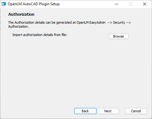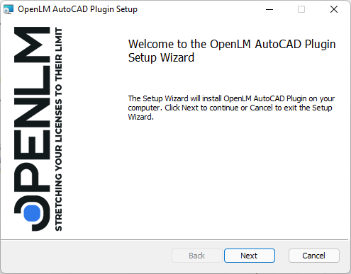 The installation file can be obtained from OpenLM sales or the download area of the website (visit https://www.openlm.com/download/ and locate the AutoCAD Plugin link).