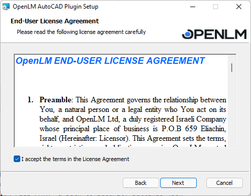 The following document describes the installation process for the AutoCAD Plugin. AutoCAD Plugin is a software component designed and developed by OpenLM to carefully save the users' work, close AutoCAD, and release the license. Take note the Plugin cannot work with the OpenLM WorkstationAgent installed on the same machine. The Autocad Plugin works With OpenLM Cloud Server only. By default, the program will be installed at C:ProgramDataAutodeskApplicationPluginsOpenLM_AutoCAD_Plugin.bundle.