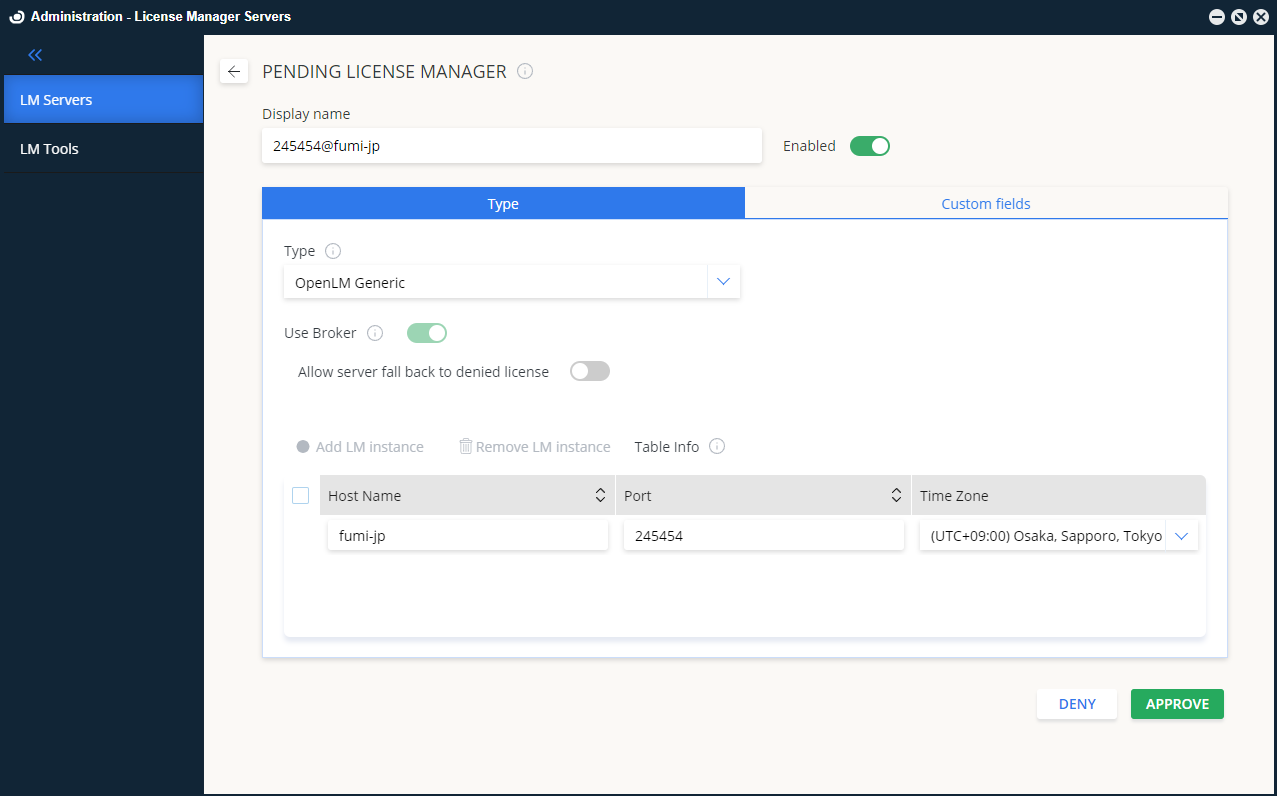 - In EasyAdmin → Start → Administration → License Manager Servers, click Add LM.