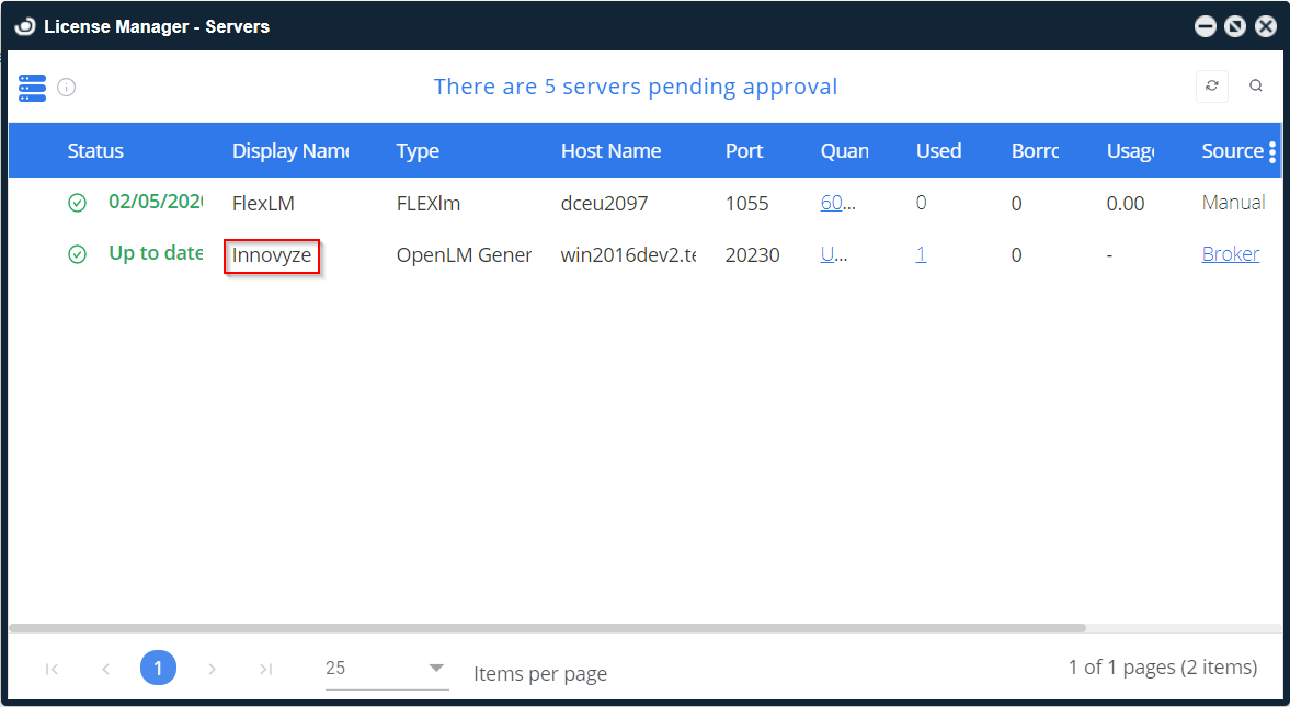 http://<OpenLM Server IP>:7019/EasyAdmin2/) or Windows Start → OpenLM → OpenLM EasyAdmin User Interface, or log in to Cloud.OpenLM.com. - In License Servers, click the message showing pending approvals.