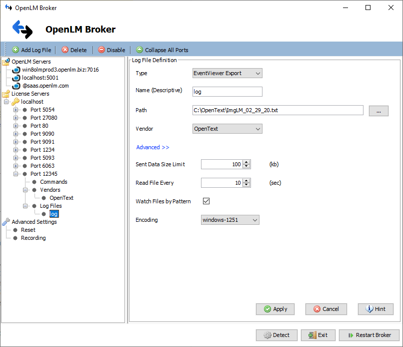 5. In Log Files, click Add Log File and browse to the OpenText log file path (e.g., C:\OpenText\ImgLM_##_##_##.txt).