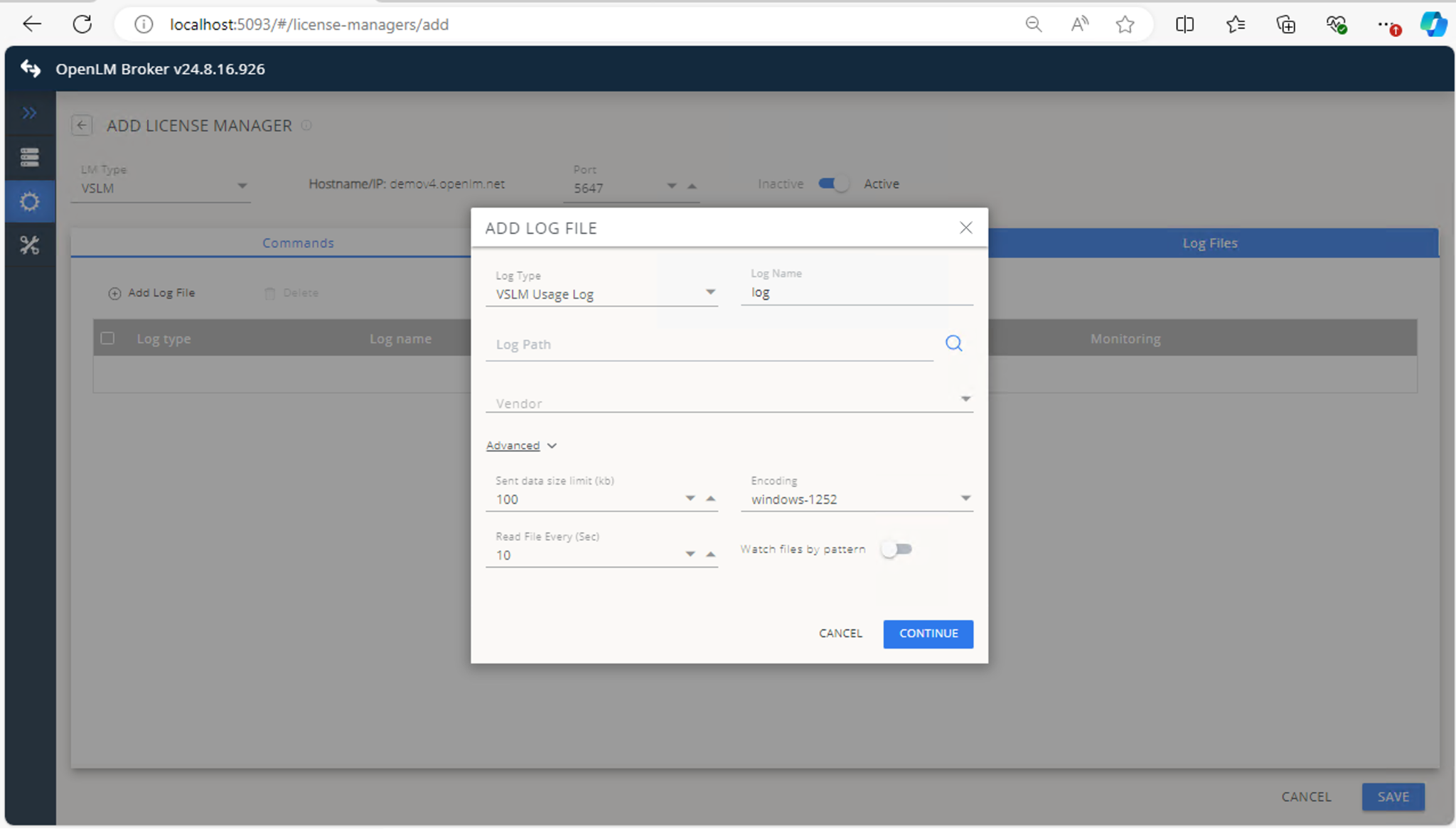 6. In Log Files, click Add Log File, browse to the VSLM log location, and ensure Watch file by pattern is off.