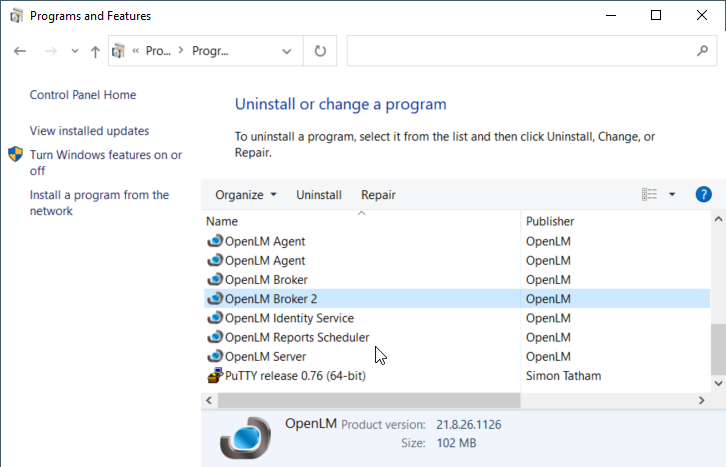 1. Locate and click on OpenLM Broker in the list of names (click on Name to sort the list alphabetically). Action options for the program will appear at the top of the list (see Figure 20).