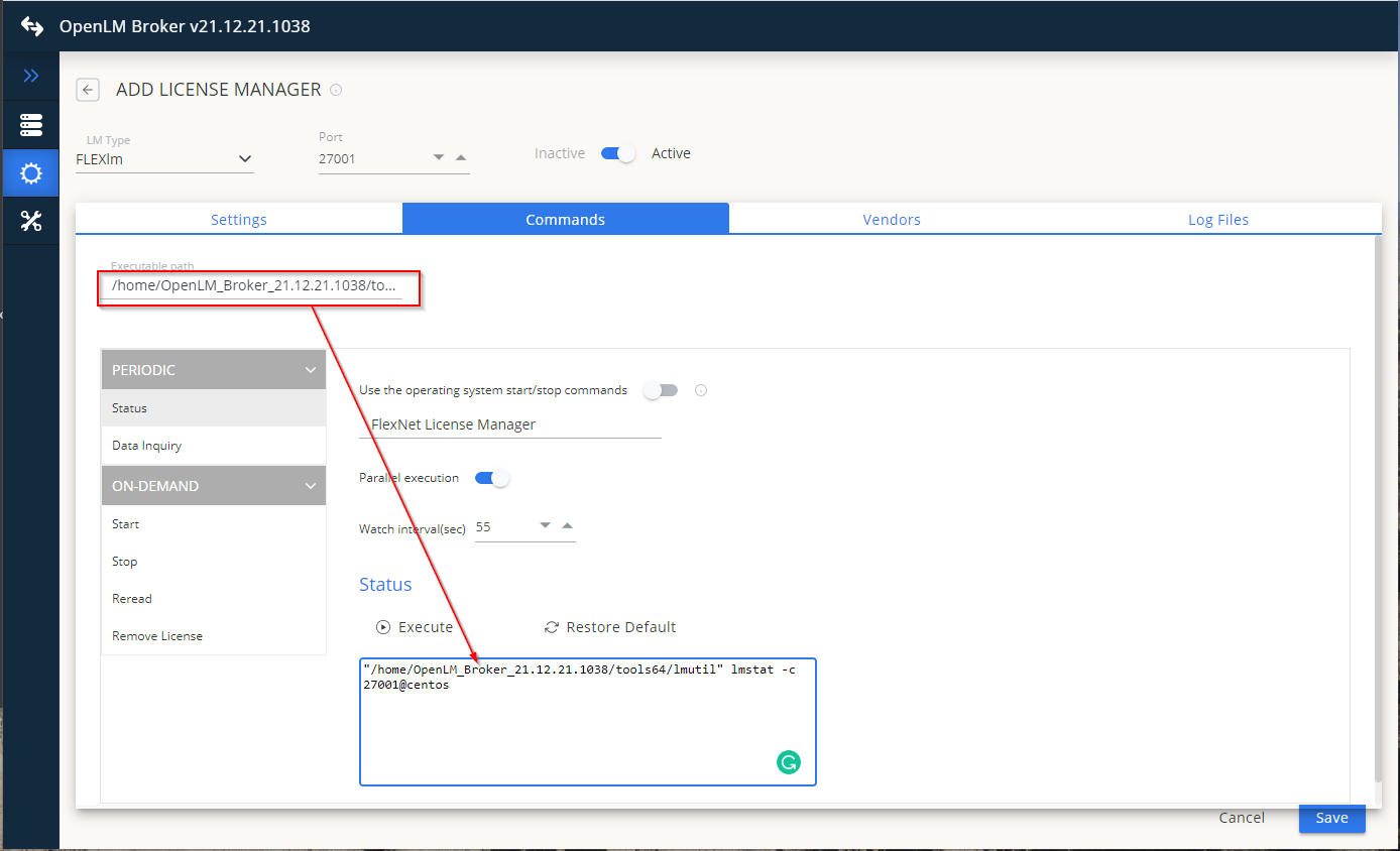 - Add the Commands information. The path to the executable can be entered and this action will update the command for all the paths and Status and Data_Inquiry.