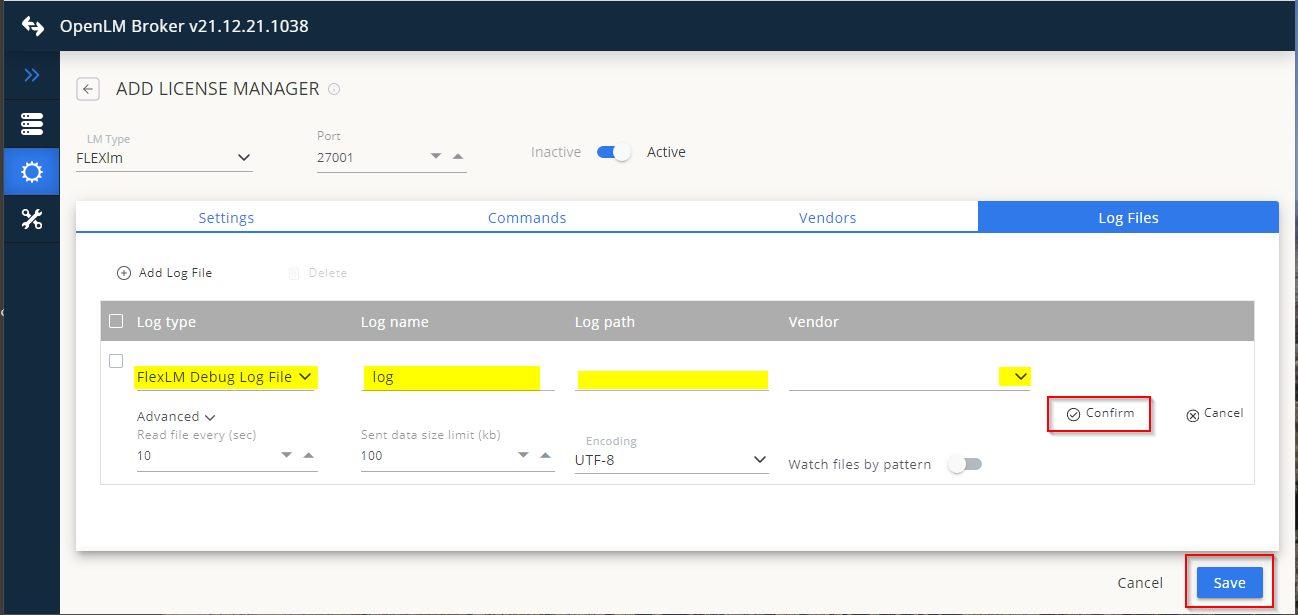 - Select the Log File Type, update the Log name, input the log path then select the vendor. Click Confirm then Save: