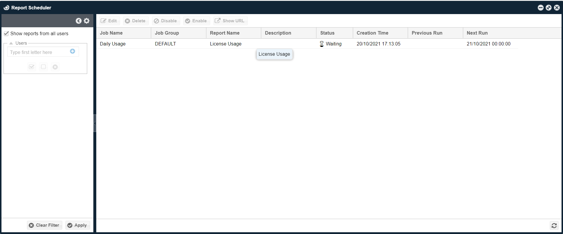 - In the window that appears, select any of the tasks you wish to modify. You can Edit, Delete, Disable/Enable and Show URL of any of the scheduled reports (this feature is identical to the one when clicking Share → Share Link)