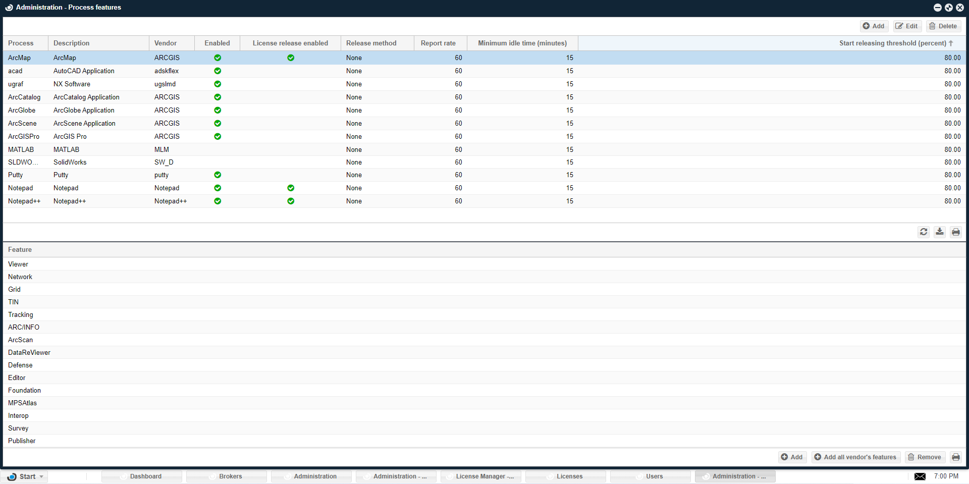 a. click the OpenLM Start → Administration → Process Features. The Administration - Process features window opens: