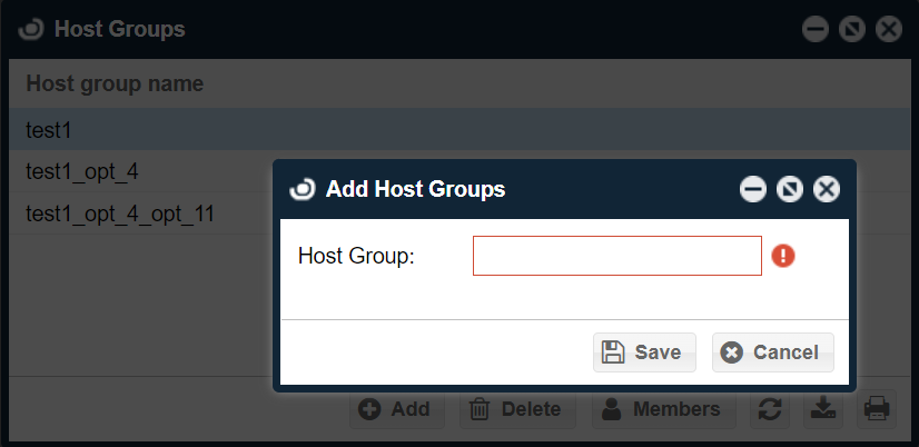 3. Click the 'Add' button, and add a Host group (e.g.: "test test test").