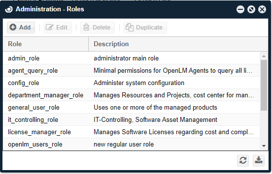 The OpenLM SLM supports a role-based security feature that enables system administrators to implement customized access to OpenLM tools by setting access roles. This feature facilitates the implementation of OpenLM tools for diverse groups; like help desk, system administrators, managers, and developers. The role-based security system secures nearly all the resources of the OpenLM system's entities, such as listed servers, fields and action buttons.