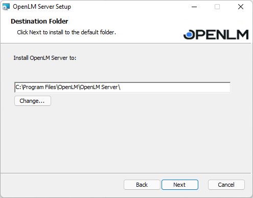 On the "Destination Folder" screen, you can change the default install directory for the OpenLM SLM. Click "Browse" to select a new location. We recommend leaving the default location as-is.
