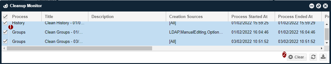 To delete cleanup results check removed groups (1) and press the Clear button (2):