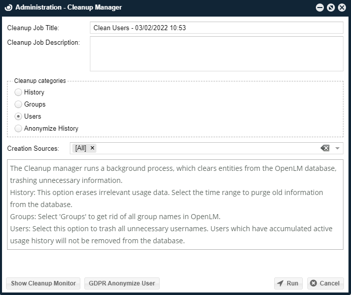Cleanup Manager runs a background process that removes all entities from the OpenLM database deleting unwanted information. Such entities include groups and users that do not work in the organization or don't use engineering licenses anymore.
