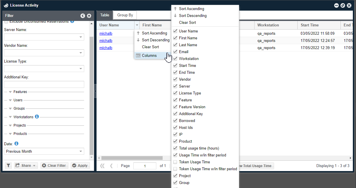 The smart Filter enables users to build a customized list of licenses and easily obtain useful information regarding these licenses. There are some unique features to the "License usage" window's filter: