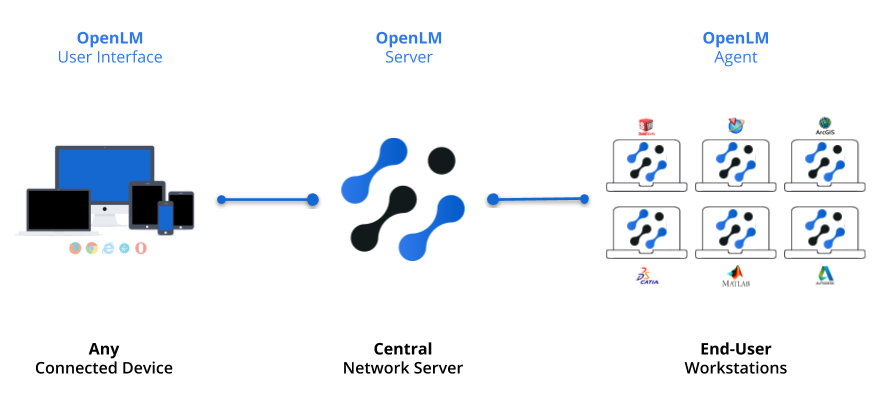 - 中央サーバーにOpenLM SLM、ライセンスサーバー自体にOpenLM Brokerがあり、FlexLMライセンスマネージャーのファイルと対話する必要があります。