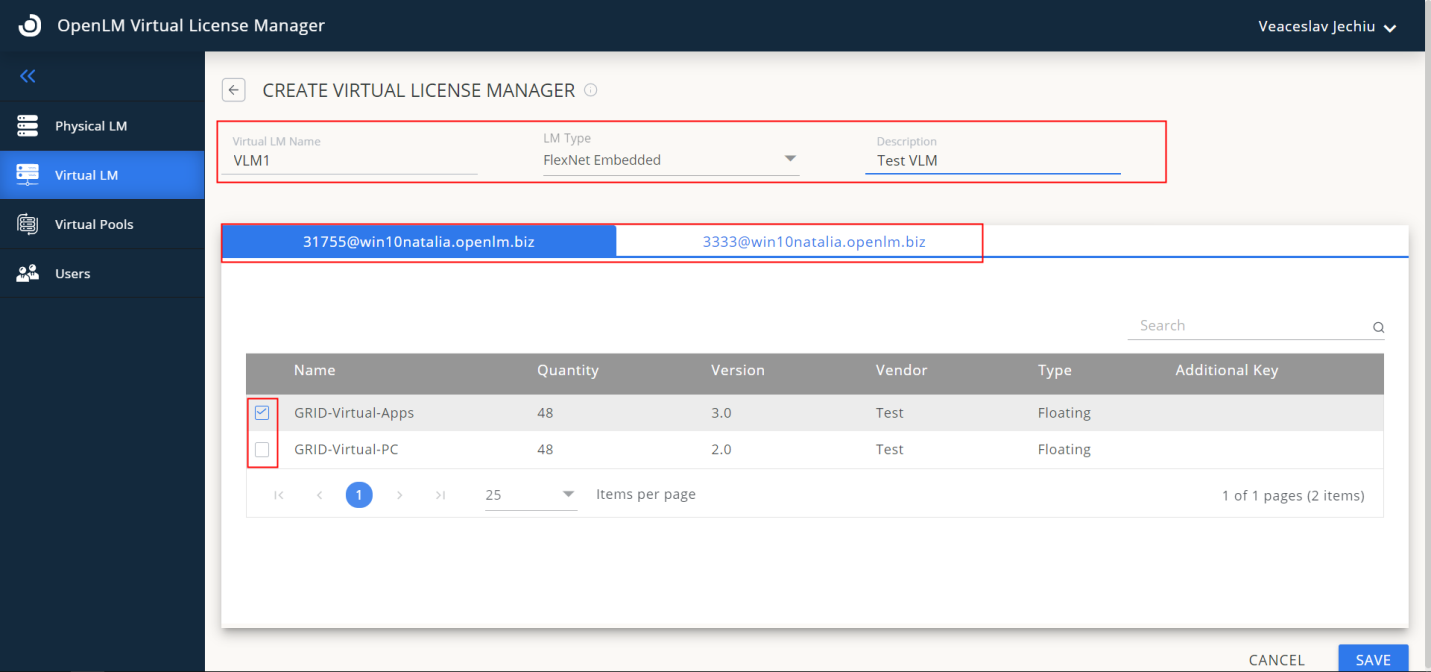 3. Once you have selected the desired features from one or both Physical License Managers to assign them to the Virtual License Manager, click "SAVE". To cancel the operation or return to the previous page, simply click "CANCEL".