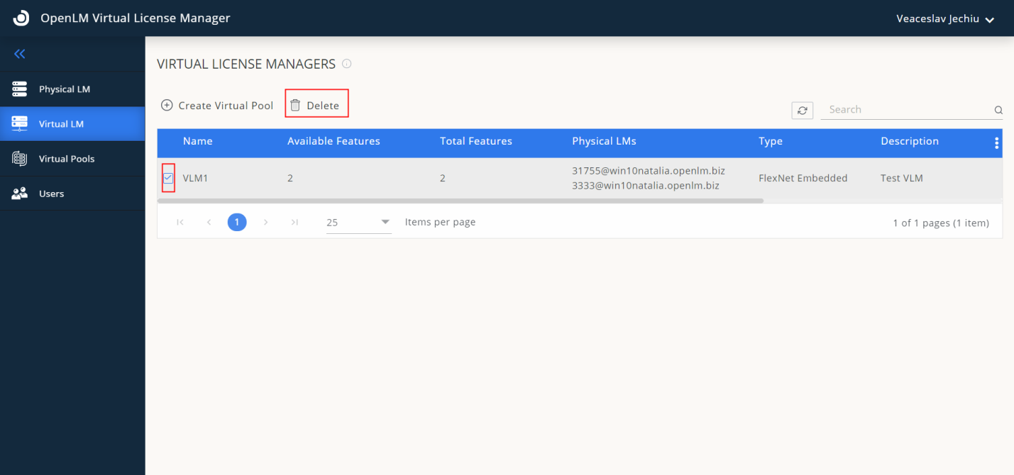 • To delete a Virtual License Manager, select it and click the "Delete" button.