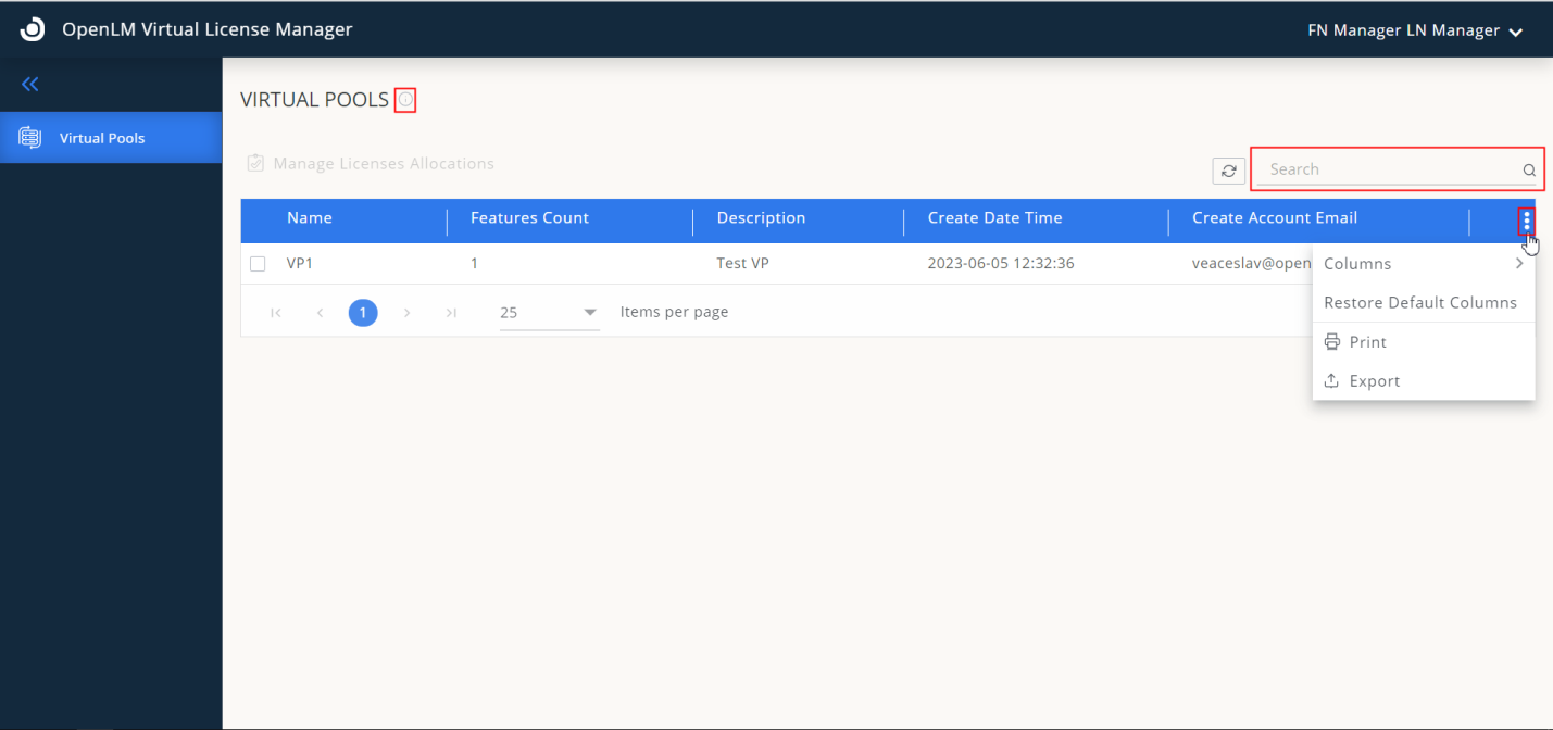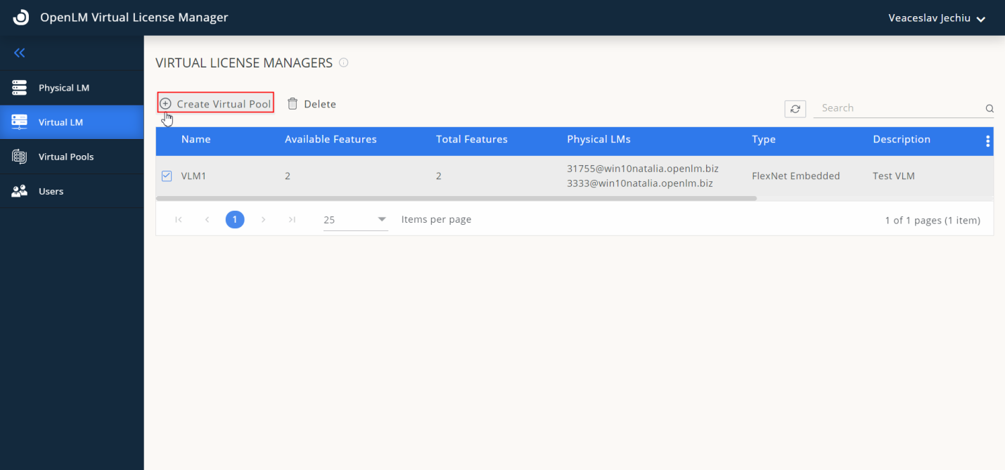 1. To create a Virtual Pool, select one Virtual License Manager from the list of tables and click the "Create Virtual Pool" button.