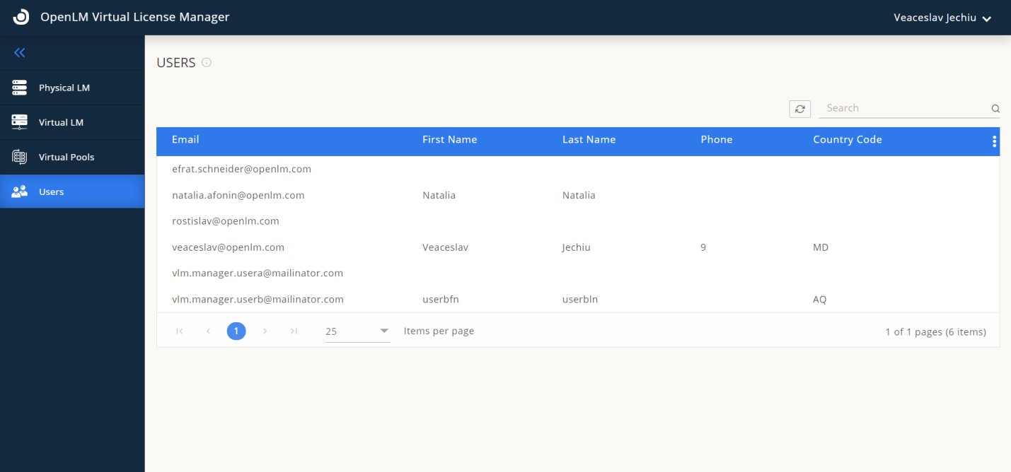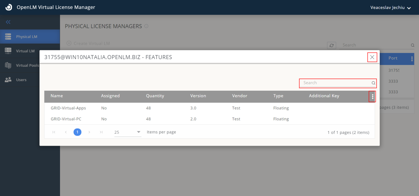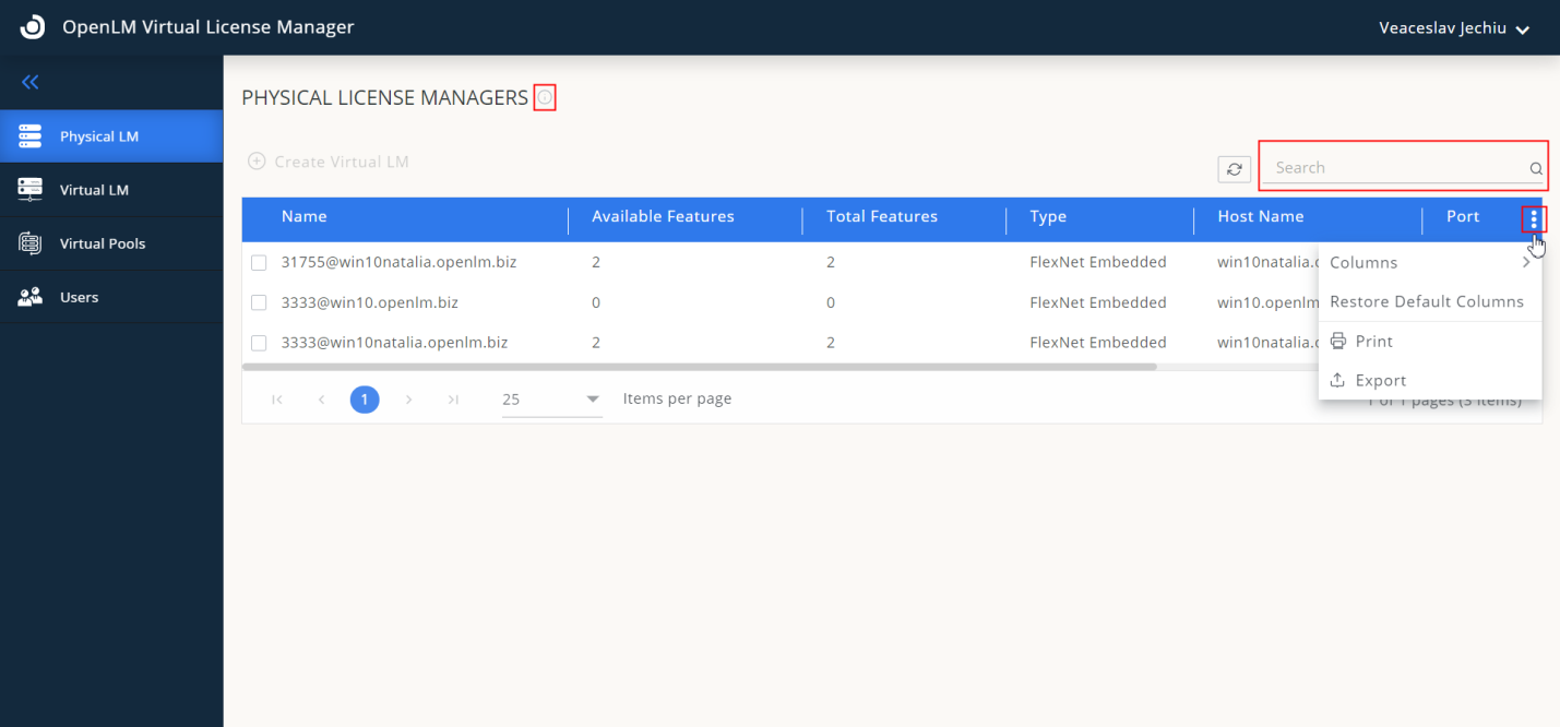 • Easily find a specific Physical License Manager by using the search field. Enter the name you are looking for, and the table will automatically filter the results.