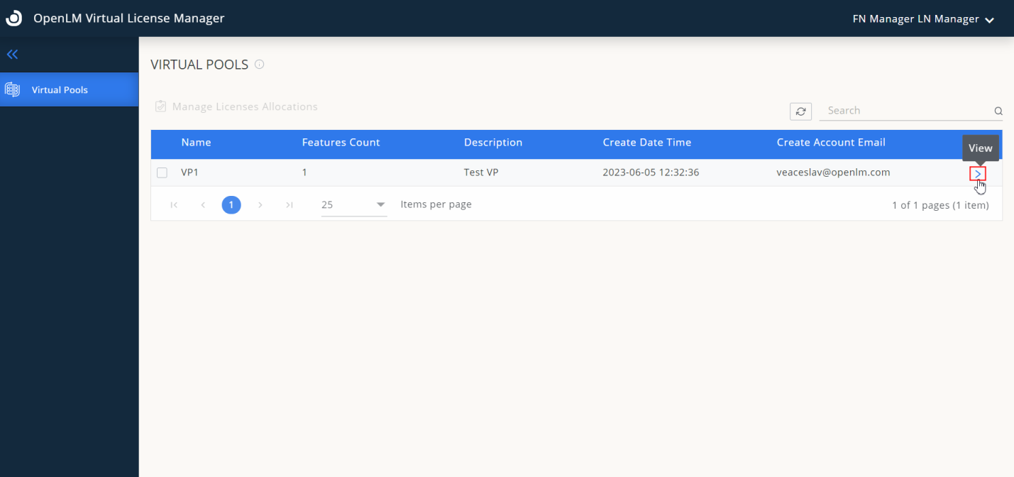• To view features, click the "View" icon at the end of the Virtual License Manager record.