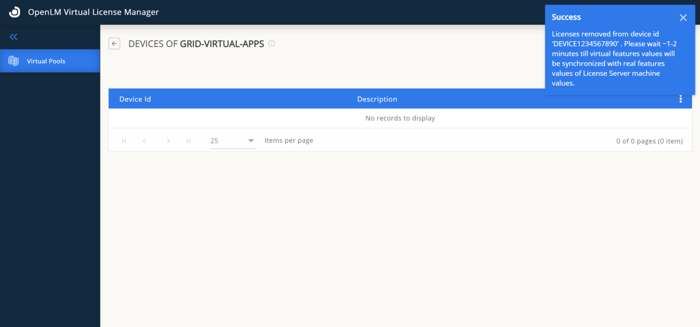 • Additionally, users have the ability to delete Virtual Pools, and when a Virtual Pool is deleted, the quantity of licenses associated with that pool is returned to the feature of the license manager it was created from, increasing its value back to the number of licenses in the deleted Virtual Pool.