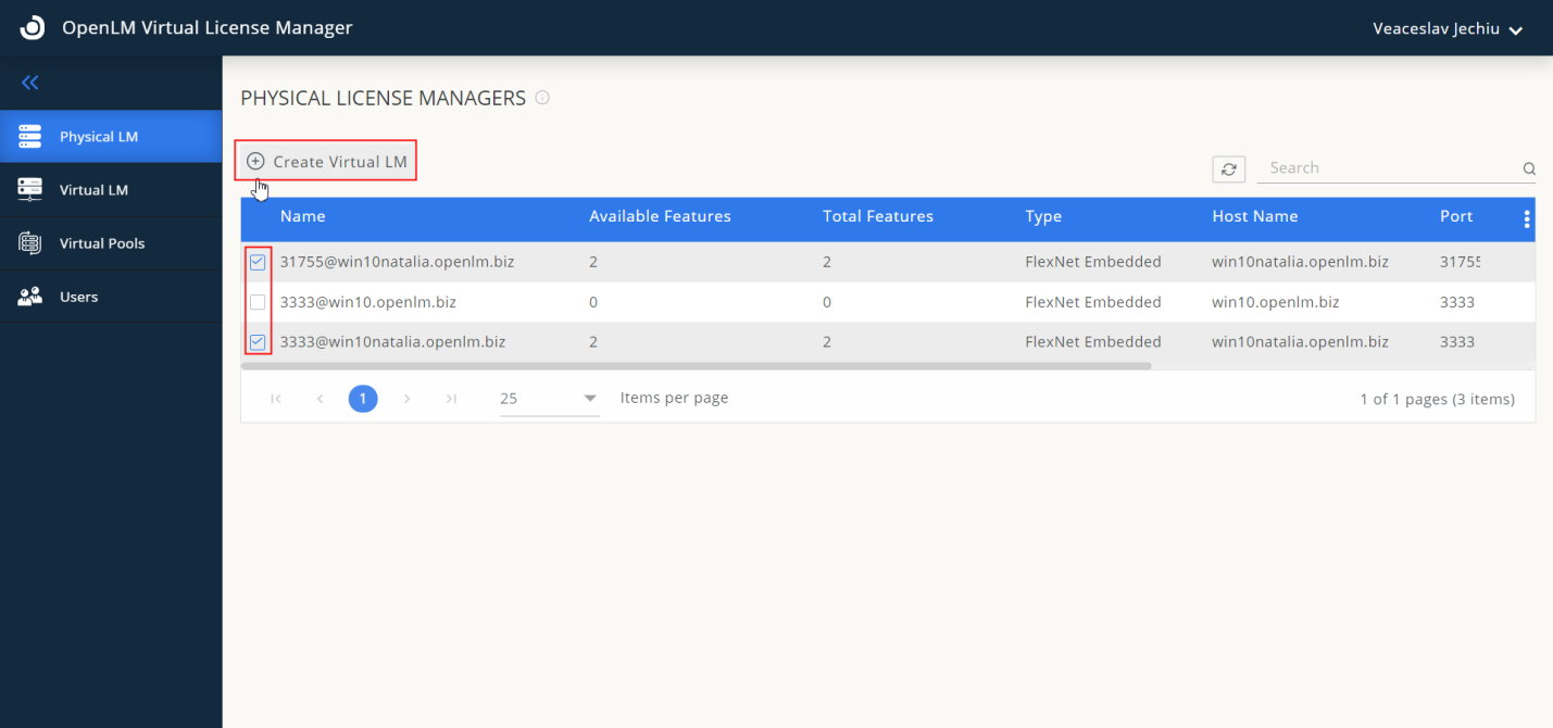 1. To create a Virtual License Manager, select the Physical License Managers tab and click the "Create Virtual LM" button: