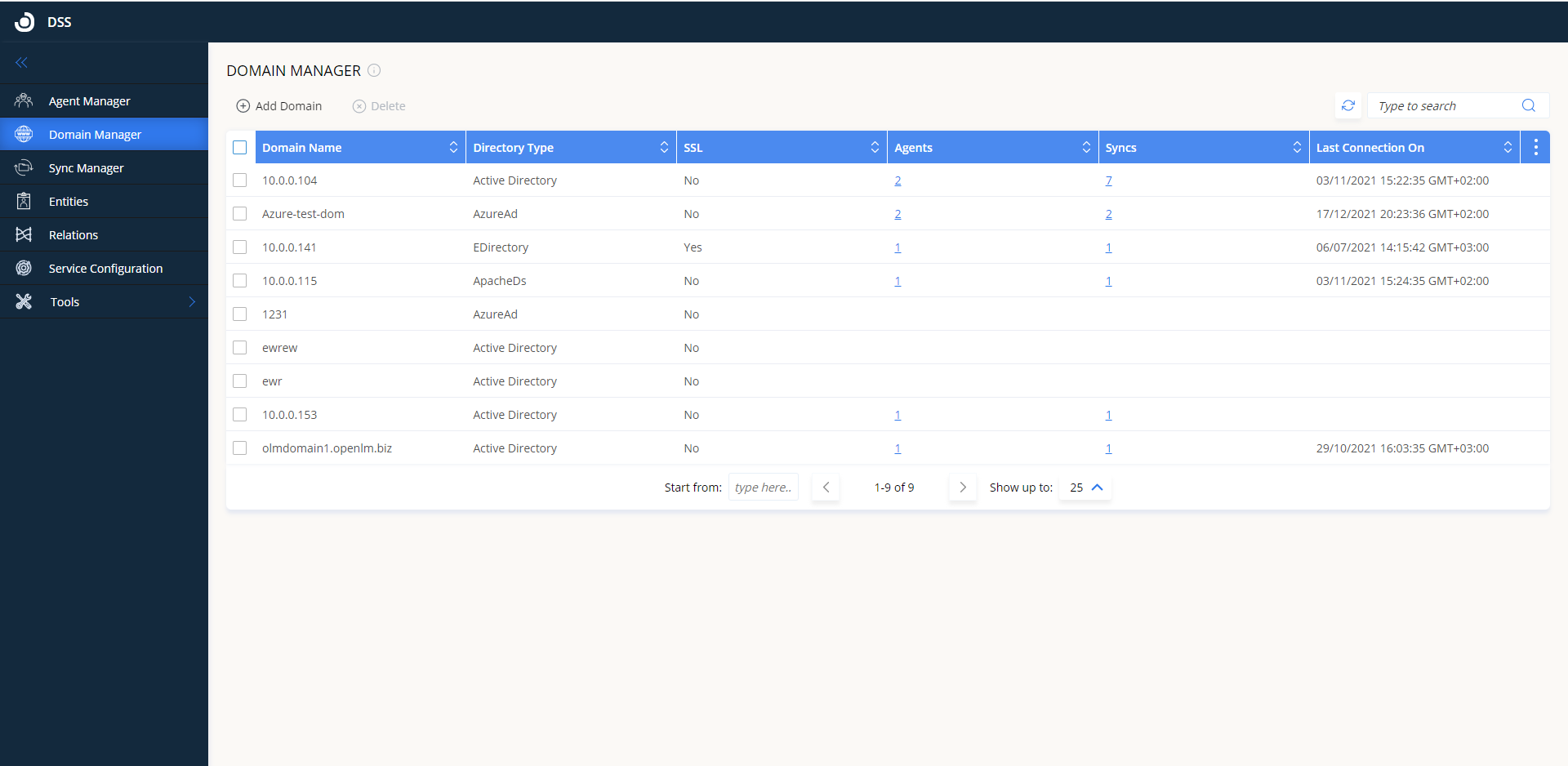 - One or more DSAs connect to the DSS. DSA can be installed on the same machine as DSS or a separate one. Its function is to take the sync definitions from DSS, query the domain directory, and report the data back to DSS.