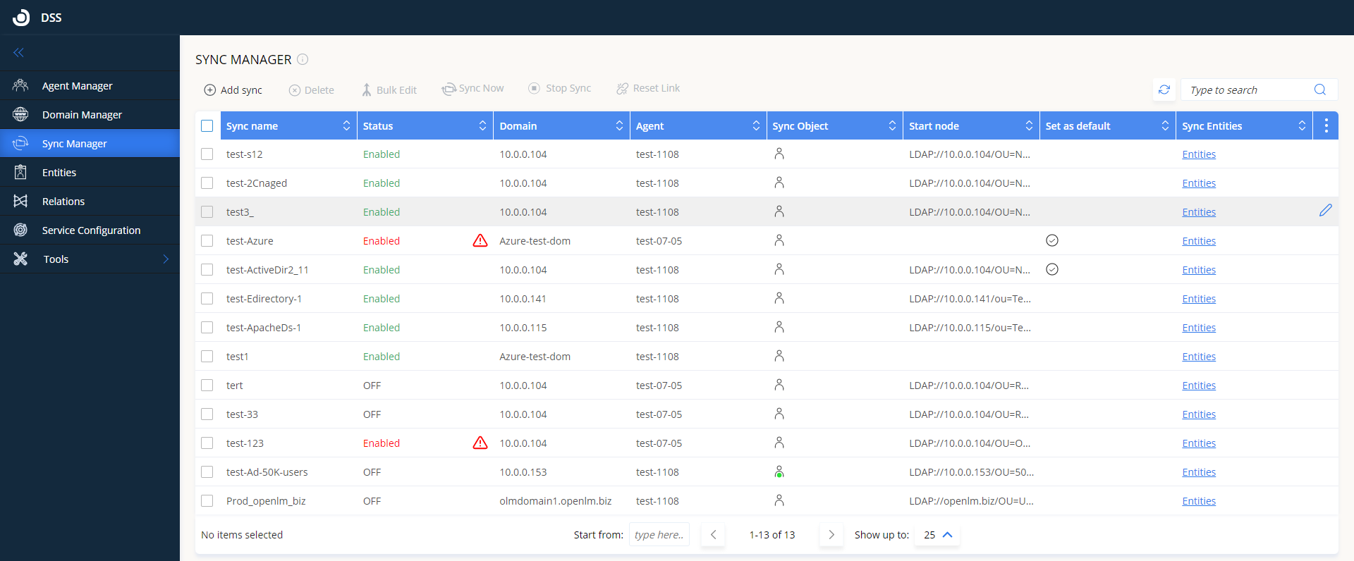 On the Relations tab, you can see all the relations an entity has in the DSS database, including the agent that queried the directory for this entity, the domain to which the entity belongs, the sync definition it is associated, the entity name, its parent name (if any) and the last time it was synced on. Use the filters to see which relations were updated and when.