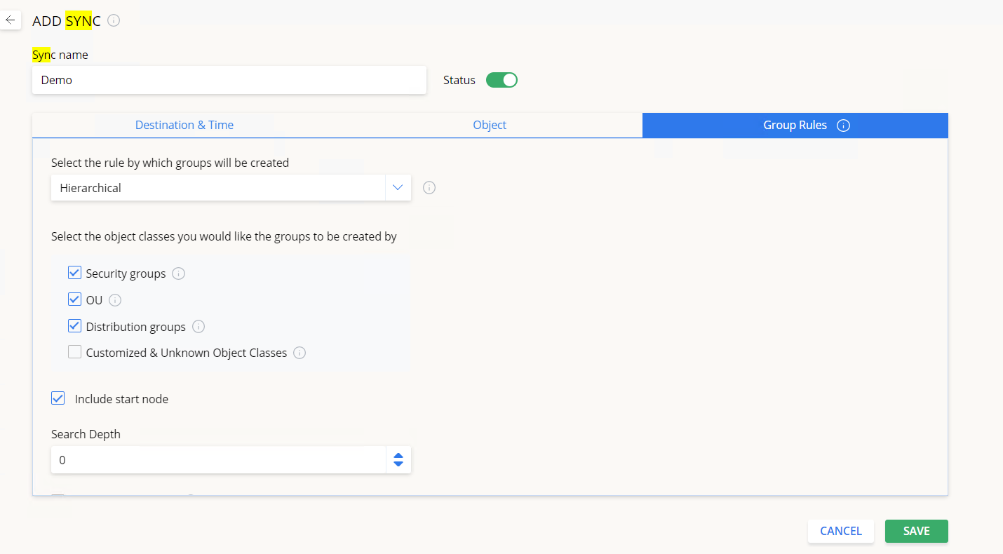 Search depth - define the sync depth. This option allows limiting the synchronization process to a certain hierarchical level: