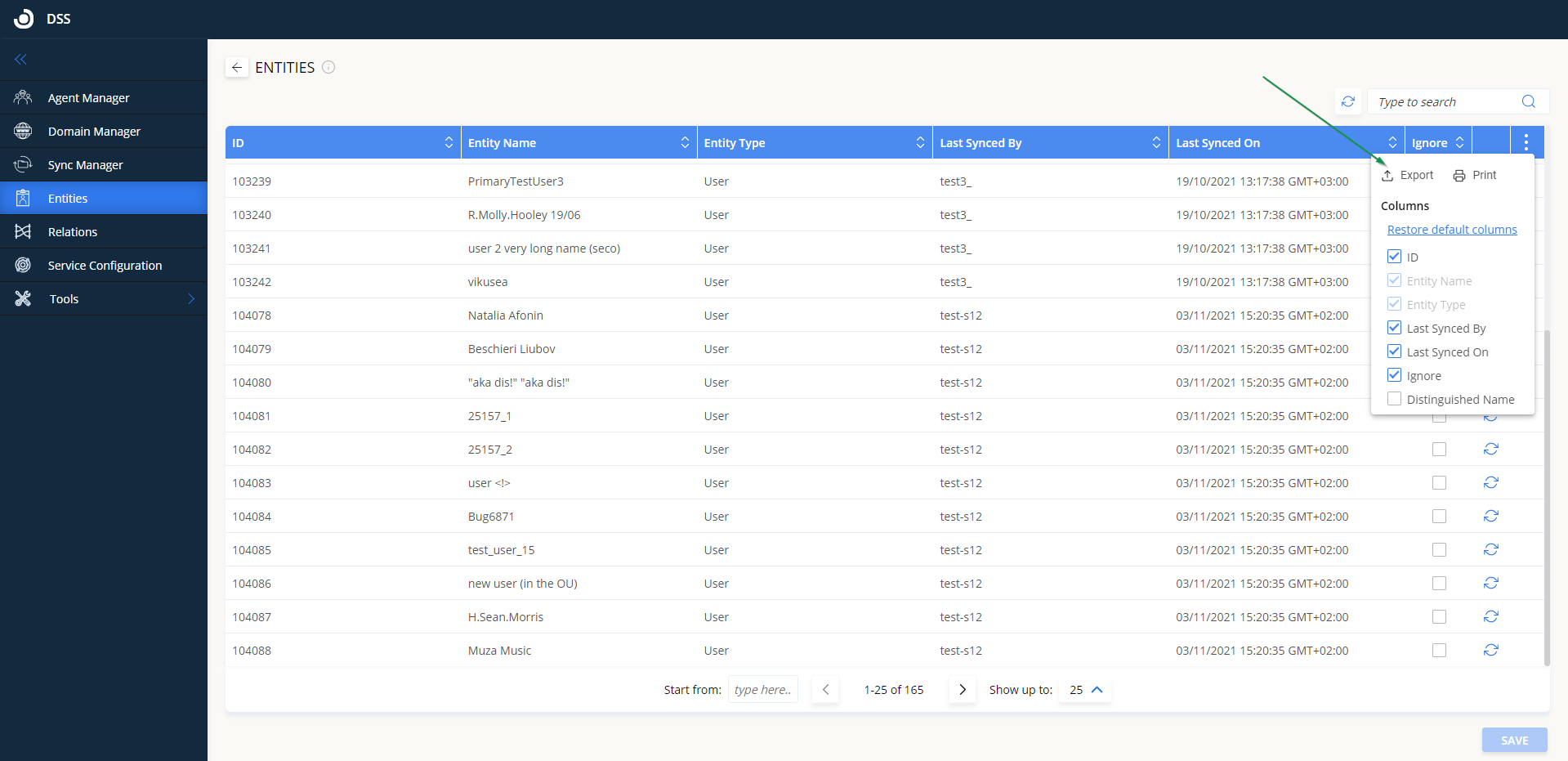 On the Entities tab, you can see the entities created by the DSS synchronizations and set individual to ignore flags. The columns show the ID an entity has in the DSS database, the entity name, the entity type, which definition last synced it, and when was the last time it was synced. Use the filters to see which entities were modified by which sync, or search for a specific entity. Also, there is the possibility to customize the list of columns, print or export the table and configure the number of entities displayed on one page: