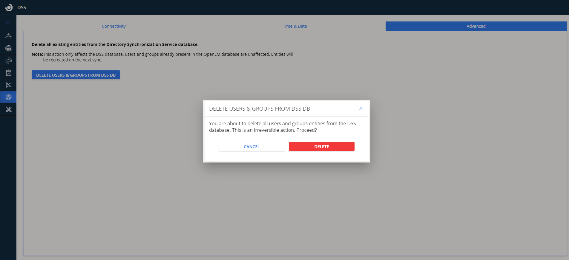 - The Advanced tab allows deleting users and Groups from the DSS database. It should be used to delete entities and relations from the DSS Database and should not be used in the process of the initial configuration of DSS. Be mindful as this is an irreversible action: