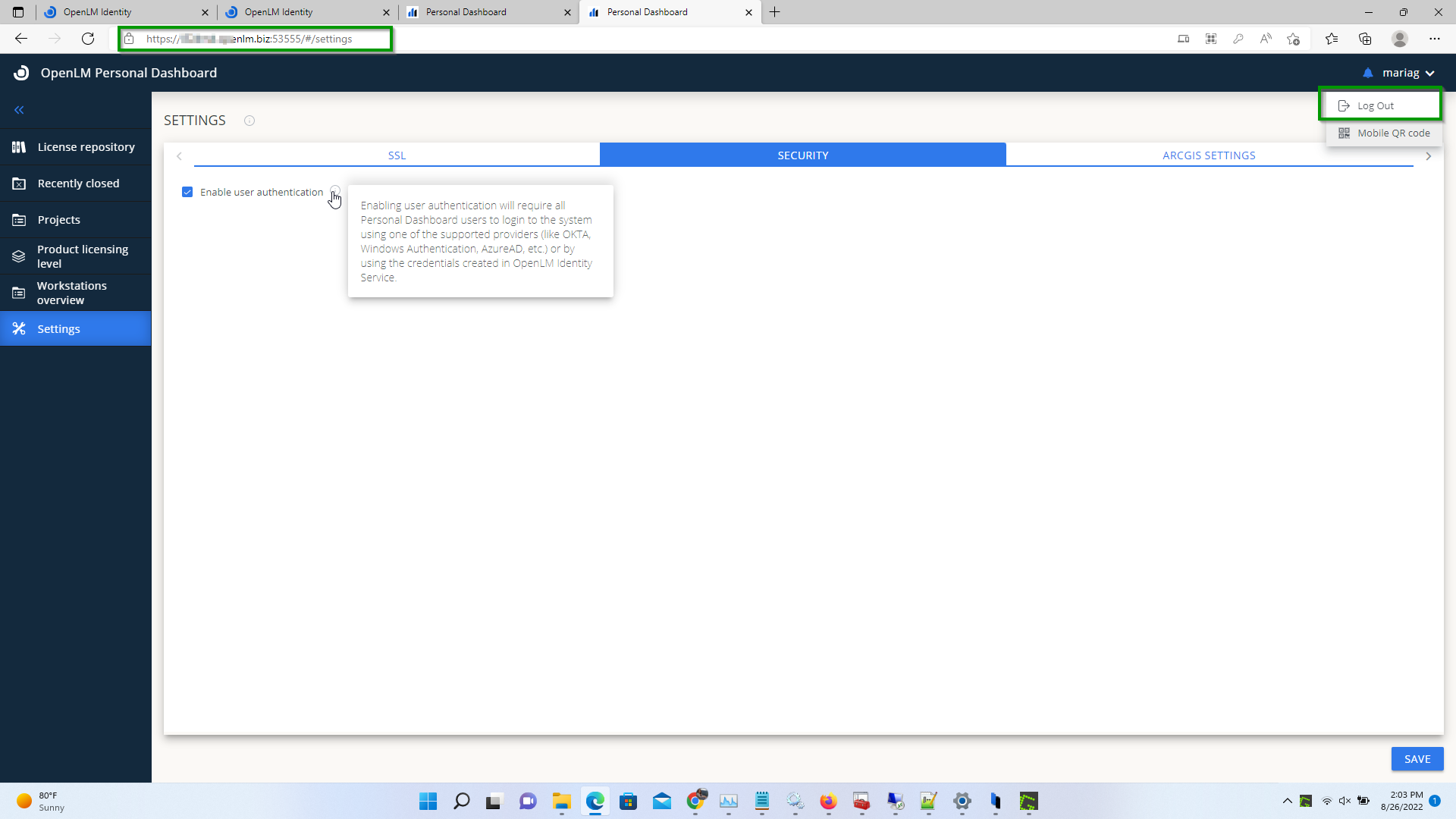 - Restart the End User Services Service and, if necessary, refresh the page. We observe that now it is possible to log out from our Personal Dashboard Account: