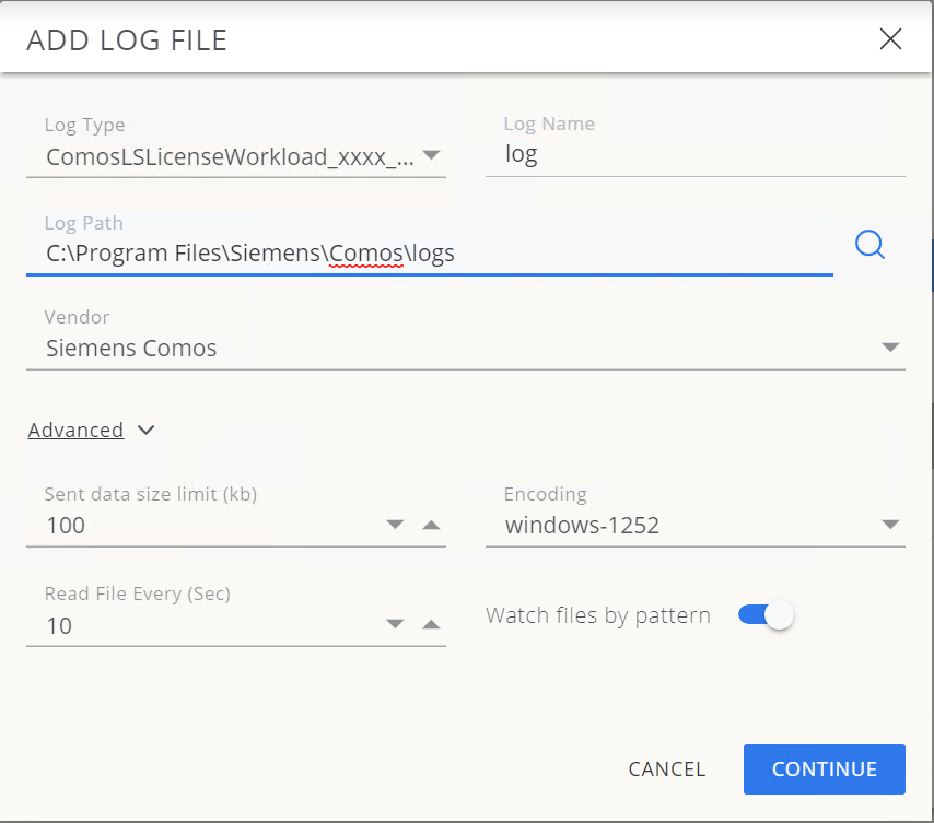 - Go to the Log Files tab → Add Log File, browse to the Comos log file, enable Watch file by pattern, and click Continue.