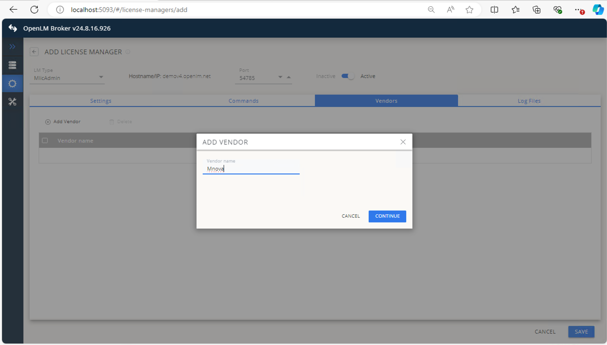 7. In Vendors, click Add Vendor, enter Mnova, and click Continue.