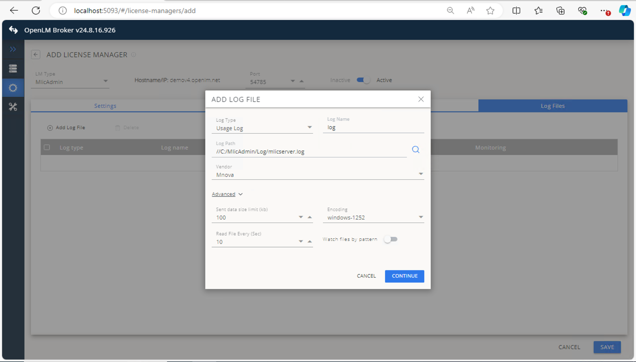8. In Log Files, click Add Log File, ensure Watch file by pattern is off, then click Continue.