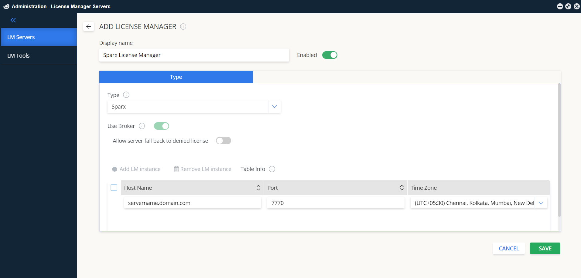 1. In EasyAdmin → Administration → License Manager Servers, click Add LM.