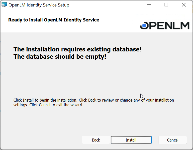 4. The Identity Service requires an empty database. Make sure you have one before continuing with the installation then click Install: