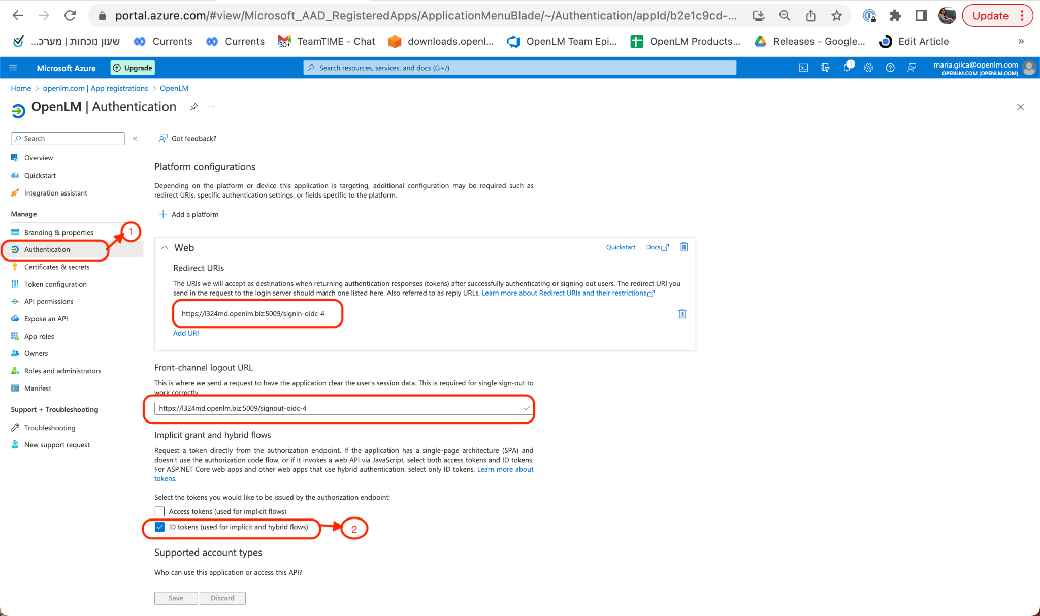 - Return to your Azure Active Directory account. Navigate to the Authentication section. Click Add Platform. Choose "Web" then provide the information for the Redirect URLs: Front-channel Logout URL and Web Redirect URL. Check the ID Tokens and choose who can use this application. Click Configure then Save.Note: The Redirect URLs are required to be taken from OpenLM Cloud Portal (as shown in the image, in step 7 above) when adding a new external provider.