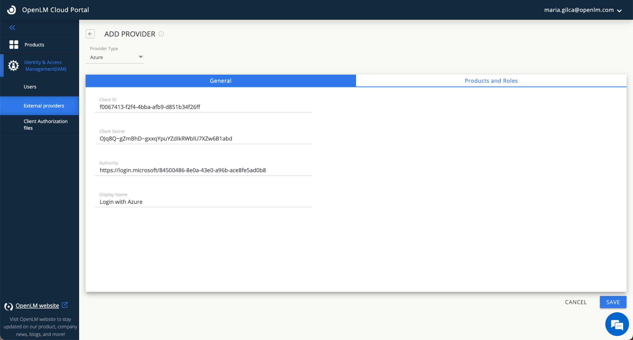 OpenLM Cloud users - Configure Azure Active Directory as an external identity provider in Cloud Portal