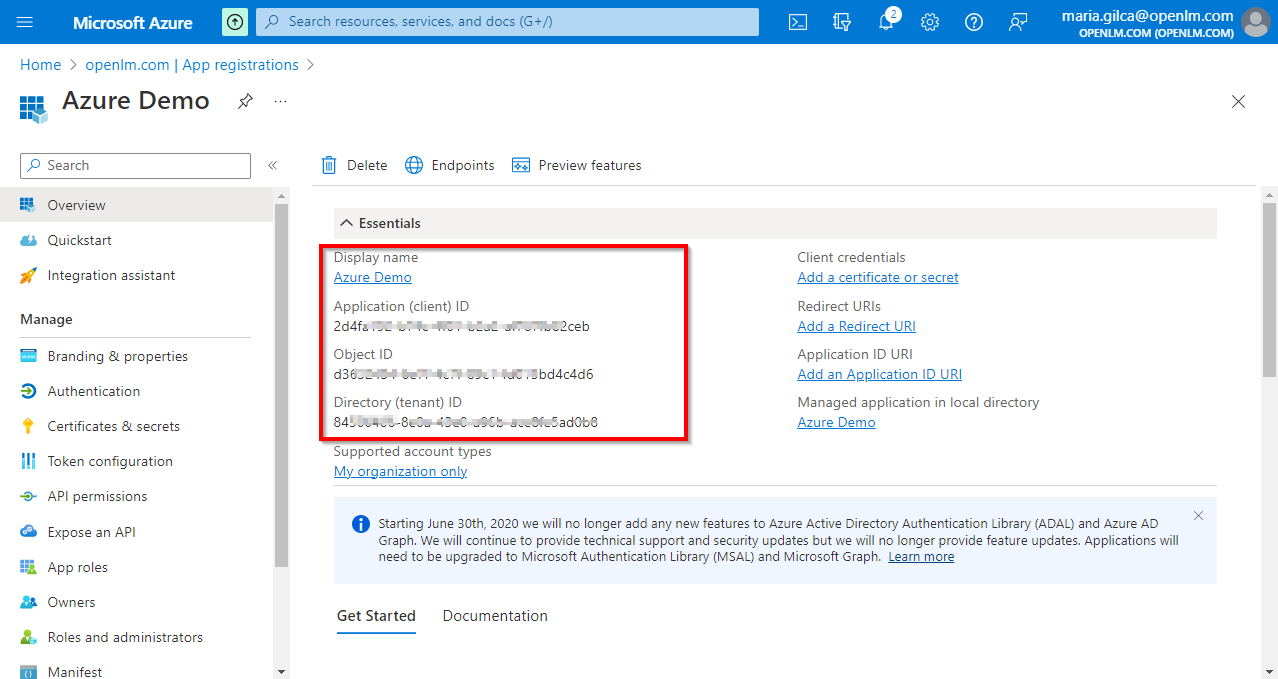 - The Application is now registered. Please have handy the information depicted below - Application (client) ID and Directory (tenant) ID (it appears after clicking the Register button).