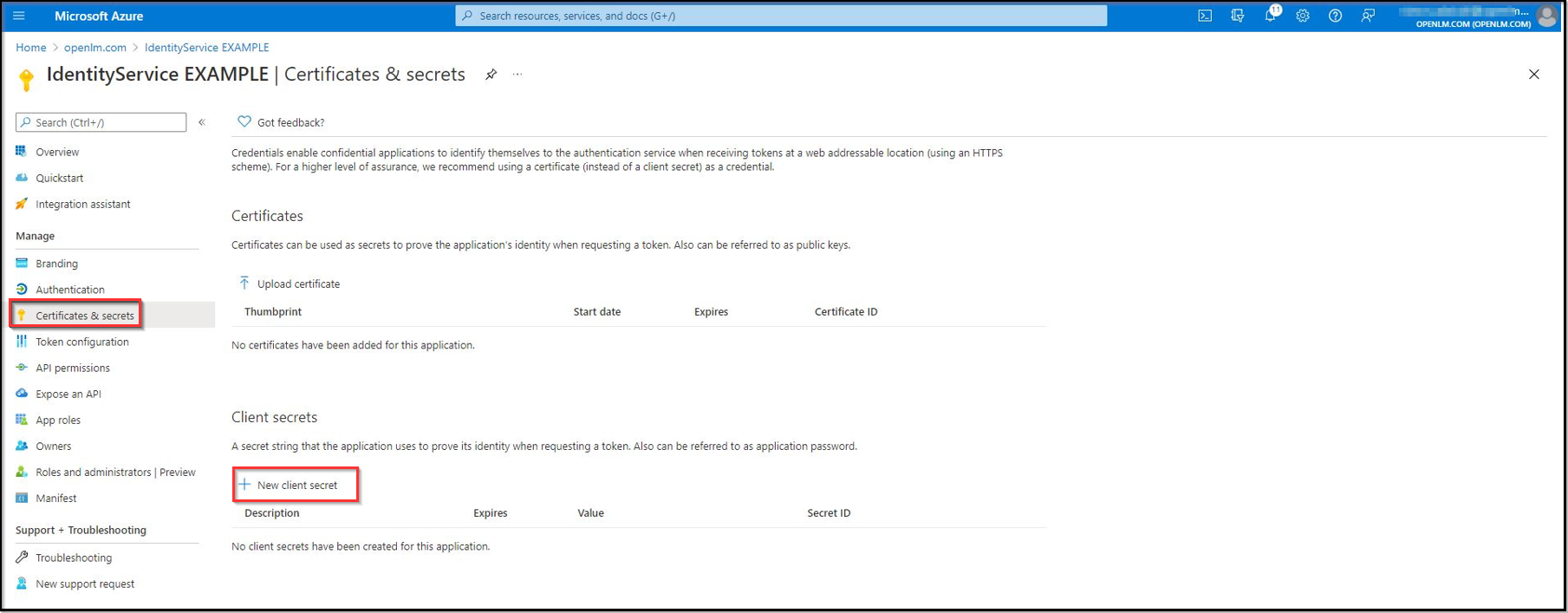 - Navigate to the Certificates & Secrets section to create a new client secret. Click New client secret.