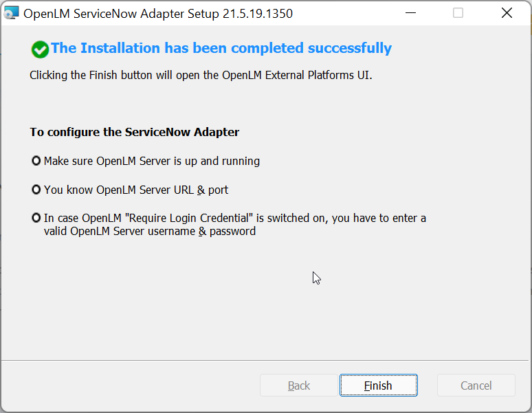 Obtain the latest External Platforms Service & ServiceNow Adapter installer file (OpenLM_ServiceNow_Adapter_Installer_#.#.###.msi) from our Downloads page