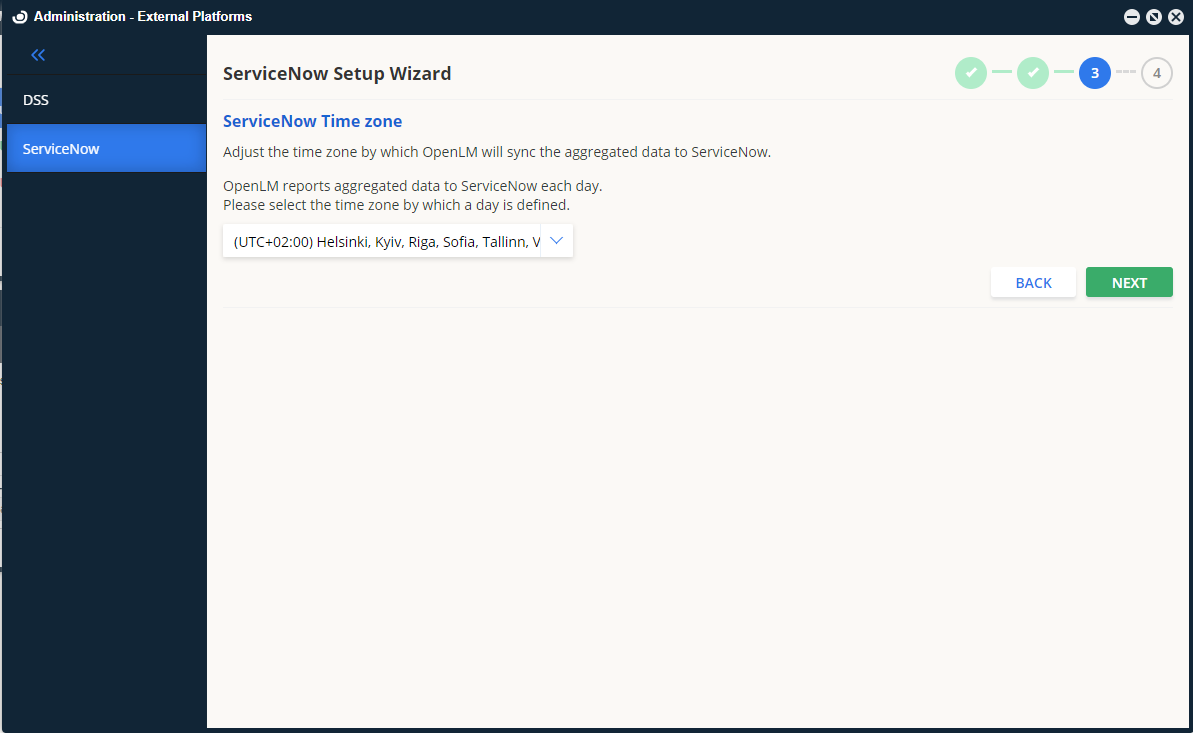 On the ServiceNow Time Zone screen, select the time zone by which OpenLM will synchronize the aggregated data it sends to ServiceNow. Since synchronization once per day, you must specify the time zone by which OpenLM will adjust the time calculations.