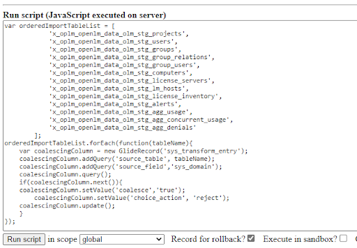 For the customers which do not want to execute this script, they can go the Transform Map corresponding to each of the staging table and activate coalesce value and set choice action to reject on sys_domain field by following these steps: