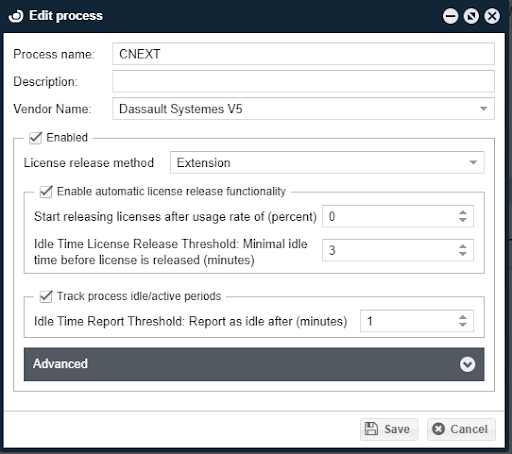 2. In the Edit process window, from the License release method drop-down menu select Extension.
