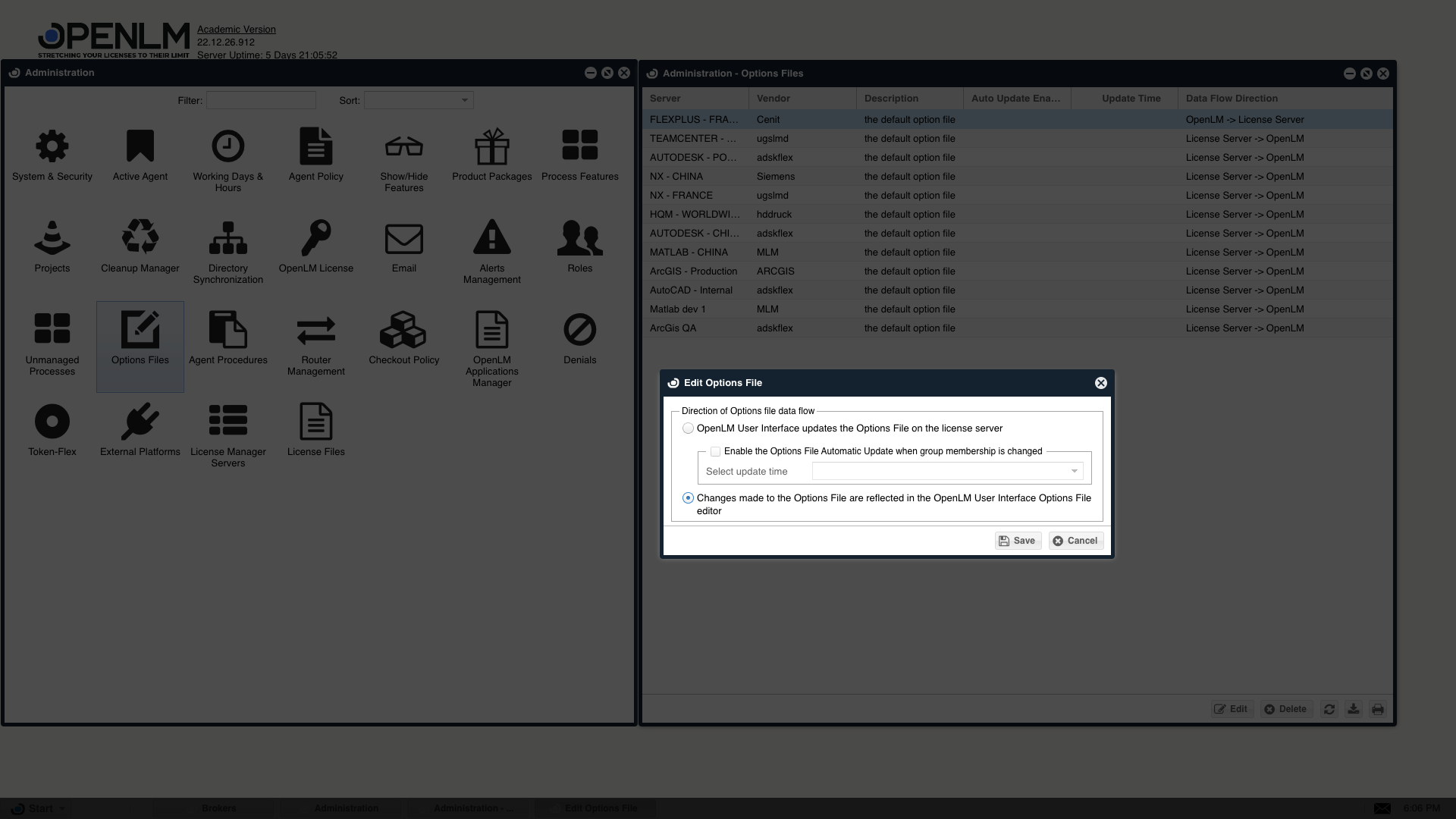- In EasyAdmin → Start → Administration → Options Files → Double-click or click Edit with an entry selected, set OpenLM to read from the Options file in the "Direction of Option file data flow" dialog frame. If you are currently configured to actively manage Options by the EasyAdmin Options files interface - remember to revert back to writing Options files after this procedure is finished. See the image below for clarification. Click Save.
