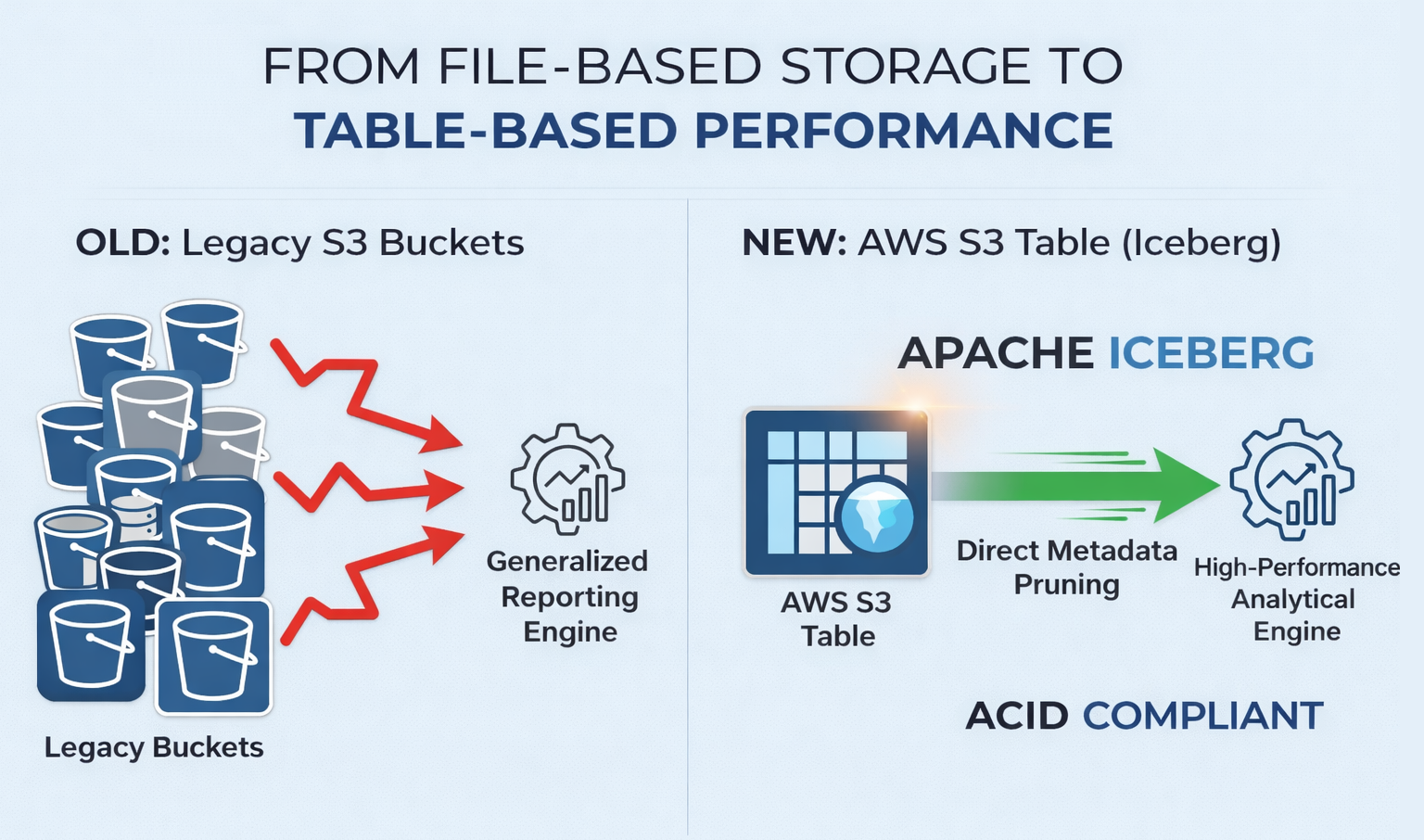 For years, the industry standard was to store reporting data in dedicated S3 buckets—a “Silo Model”. While this provided physical separation, it introduced significant technical debt, including variable query speeds and high maintenance overhead as datasets grew into the terabytes.